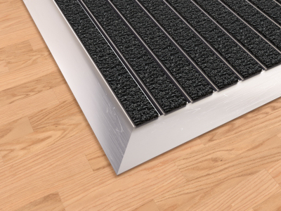 Marco perimetral para felpudo metálico, formado por perfiles angulares de aluminio, acabado natural, con alas de 20x20 mm de longitud y 3 mm de espesor. |