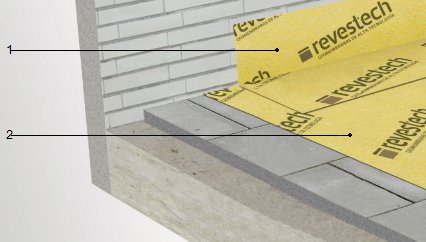 Encuentro de cubierta plana transitable, ventilada, con solado fijo, tipo convencional con paramento vertical; mediante la realización de un retranqueo perimetral de más de 5 cm con respecto al paramento vertical y de más de 20 cm de altura sobre la protección de la cubierta, relleno con mortero de cemento, confeccionado en obra, dosificación 1:8 colocado sobre la impermeabilización formada por: banda de terminación para membrana impermeabilizante flexible tipo EVAC, Dry Banda 13x30 "REVESTECH", de 127 mm de ancho, compuesta de una doble hoja de poliolefina termoplástica con acetato de vinil etileno, con ambas caras revestidas de fibras de poliéster no tejidas, de 0,52 mm de espesor y 335 g/m², fijada a la impermeabilización continua de la cubierta, con adhesivo cementoso mejorado, deformable y tixotrópico, C2 TE S1, acabado con un revestimiento de zócalos de gres rústico, de 7 cm, 3 €/m colocados con junta abierta (separación entre 3 y 15 mm), en capa fina con adhesivo cementoso de fraguado normal, C1 sin ninguna característica adicional, color gris y rejuntados con mortero de juntas cementoso mejorado, con absorción de agua reducida y resistencia elevada a la abrasión tipo CG 2 W A, color blanco, para juntas de 2 a 15 mm, formación de ventilación perimetral de la cámara con ladrillo cerámico hueco y colocación de vierteaguas cerámico de 11x24 cm, fijado al paramento, como remate de la ventilación perimetral de la cámara. Incluso complementos de refuerzo en tratamiento de puntos singulares mediante el uso de piezas especiales para la resolución de ángulos internos y externos. | ||